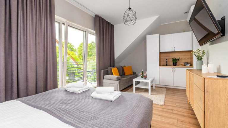 Przystanek Jantar - pokoje i apartamenty bietet Übernachtungsmöglichkeiten mit einer Terrasse oder einem Balkon. Die Unterkunft hat einen saisonalen Aussenpool und einen Garten, wo Gäste entspannen können. Es gibt eine Gemeinschaftslounge zur Verfügung sowie Grillmöglichkeiten im Freien.