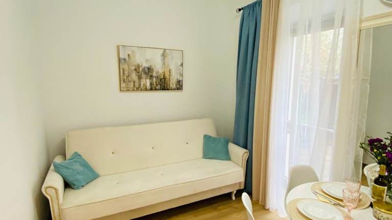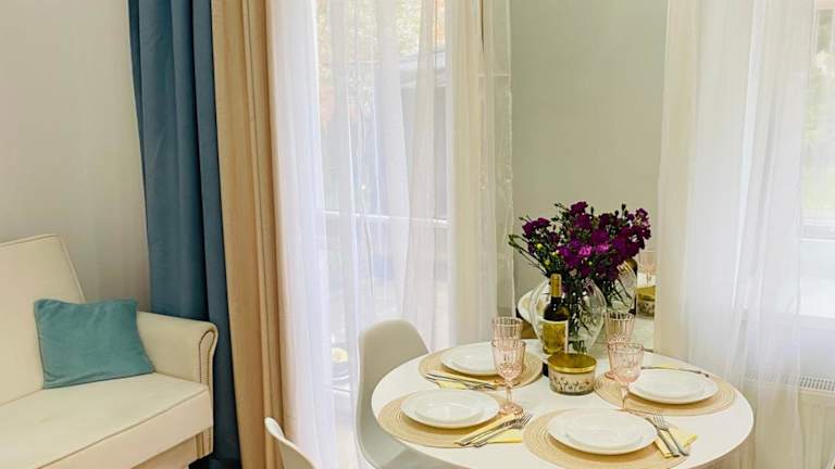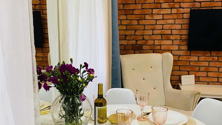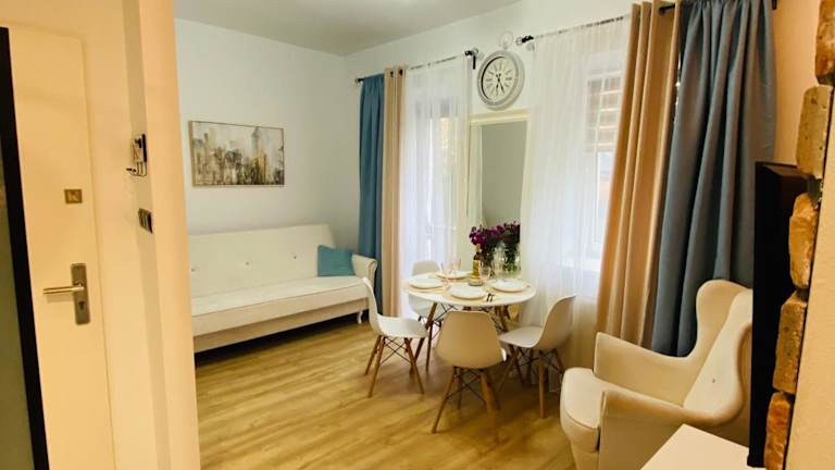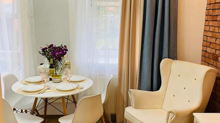 Przytulny apartament z tarasem ist eine Ferienwohnung, die durch eine Veranda oder einen Patio sowie einen Garten ergänzt wird. Kostenloses WLAN ist in der gesamten Unterkunft verfügbar. Der private Gastgeber gewährleistet einen persönlichen Aufenthalt, jedoch sind Junggesellen-/Junggesellinnenabschiede und ähnliche Feiern nicht erlaubt.