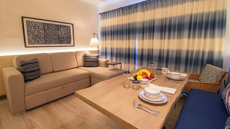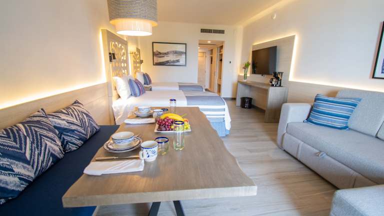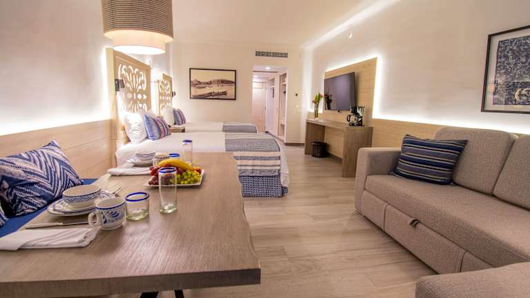 Die Zimmer bieten eine Küche und ein Badezimmer mit Dusche und Badewanne. Sie sind ausgestattet mit Klimaanlage, Safe, Minibar und einem Balkon oder einer Terrasse mit Meerblick. Jedes Zimmer hat auch einen Fernseher, ein Telefon und kann bei Bedarf mit einem Gute-Nacht-Service aufwarten. Familienzimmer sowie rollstuhlgerechte Optionen stehen zur Verfügung.