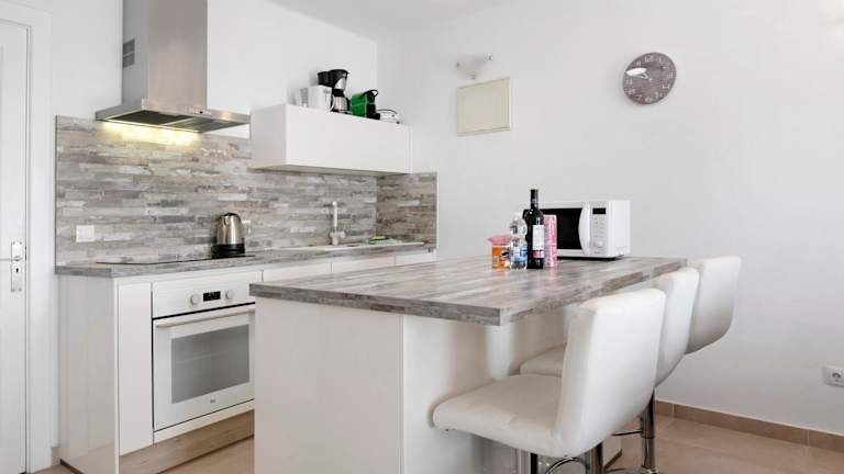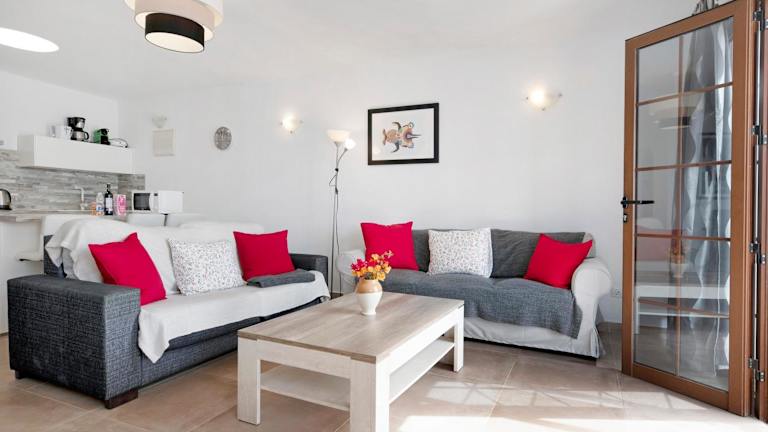 Die Ferienwohnung ist ausgestattet mit zwei Schlafzimmern und zwei Badezimmern. Es sind Bettwäsche und Handtücher vorhanden. Ein TV mit Satellitenkanälen sorgt für Unterhaltung, während eine voll ausgestattete Küche für das leibliche Wohl sorgt. Die Terrasse bietet einen schönen Meerblick.