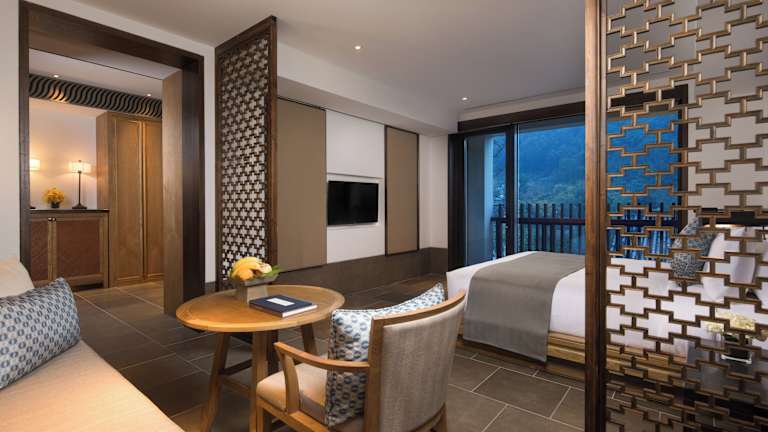 Die klimatisierten Zimmer sind ausgestattet mit einem Schreibtisch, einer Kaffeemaschine, einem Kühlschrank, einer Minibar, einem Safe, einem Flachbild-TV, einem Balkon und einem eigenen Badezimmer mit einem Bidet. Einige Zimmer verfügen über eine Veranda oder Patio sowie Flussblick. Das Zimmerangebot beinhaltet Bettwäsche und Handtücher.