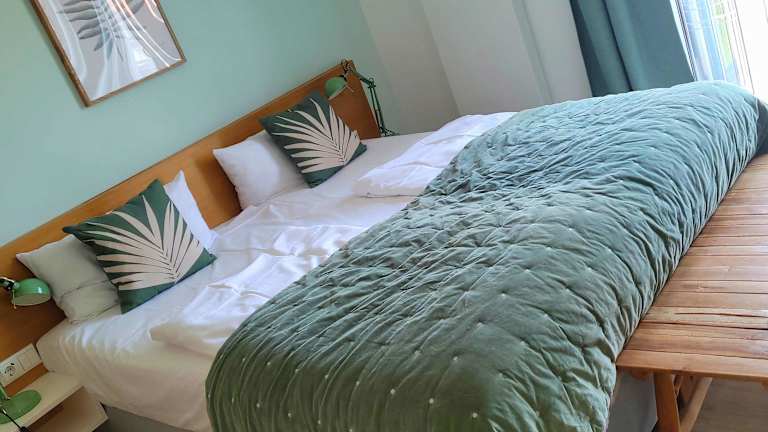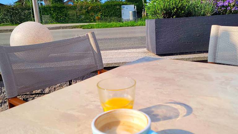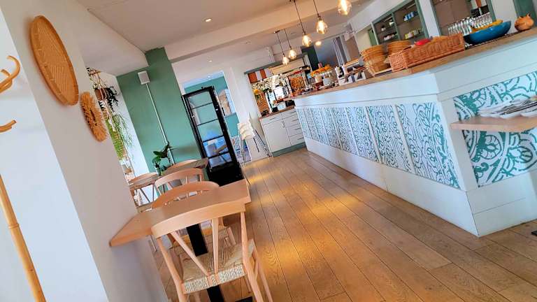 Das Frühstück wird als Buffet angeboten und ist vegetarisch oder vegan. Ein Café befindet sich ebenfalls vor Ort.