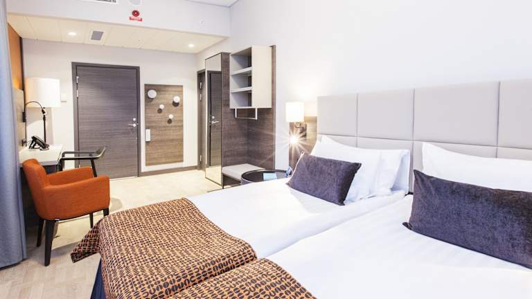 Die Zimmer sind mit einer Klimaanlage ausgestattet und verfügen über ein Queensizebett sowie ein Sofabett. Weitere Einrichtungen umfassen eine Minibar, einen Schreibtisch, einen Kühlschrank sowie ein Bügelset. Zur Standardeinrichtung gehören Telefon, TV-Gerät, Radio und kostenloses WiFi. Im Badezimmer befindet sich eine Dusche und ein Haartrockner. Das Hotel bietet rollstuhlgerechte Zimmer sowie Familien- und Nichtraucherzimmer.