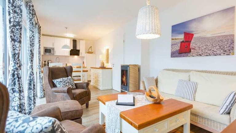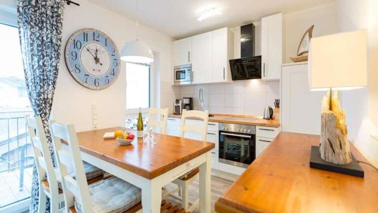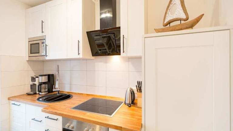 Die Ferienwohnung verfügt über zwei Schlafzimmer und eine voll ausgestattete Küchenzeile, die einen Kühlschrank und einen Geschirrspüler beinhaltet. Zudem gibt es ein Badezimmer mit Dusche und Haartrockner. Handtücher und Bettwäsche werden zur Verfügung gestellt. Es stehen Familienzimmer zur Verfügung.