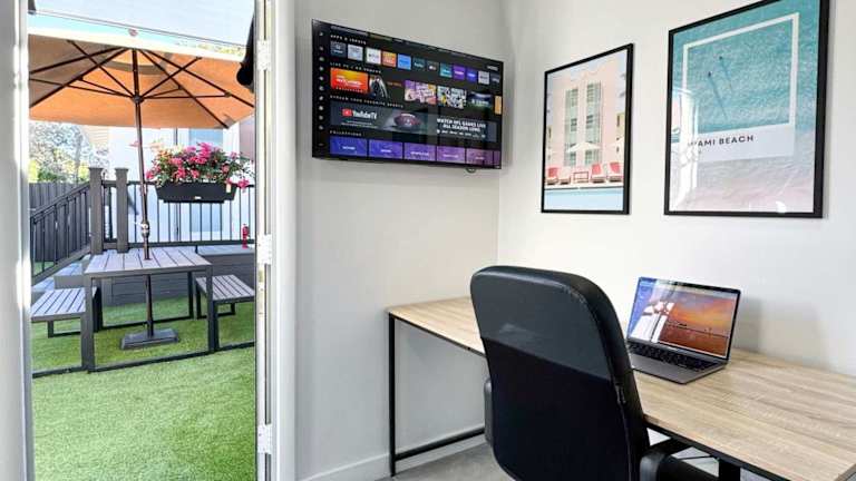 Das Ferienhaus Studio with Office Space and Hot Tub bietet eine heimelige Atmosphaere und umfasst eine Veranda bzw. ein Patio sowie einen Garten. WLAN steht kostenlos zur Verfügung.