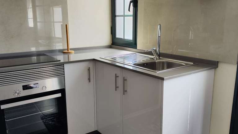 Die Unterkunft verfügt über eine voll ausgestattete Küchenzeile, in der sich eine Kaffeemaschine und ein Kühlschrank befinden.