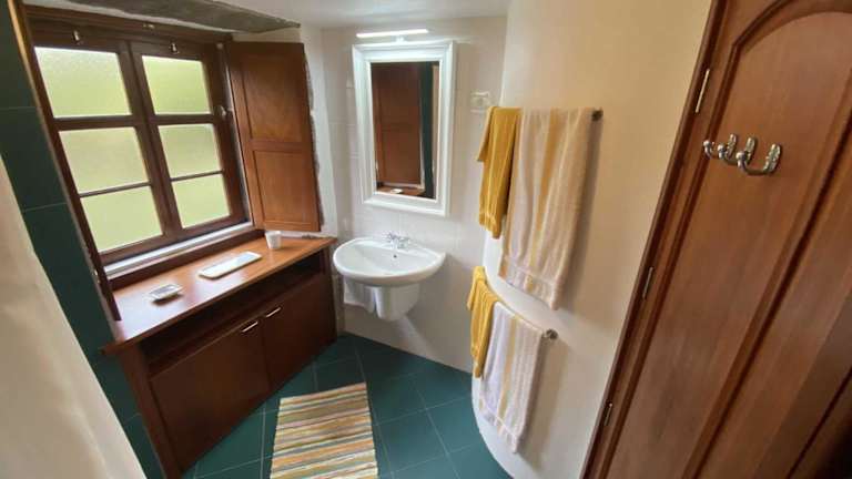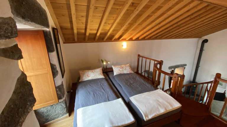 Das Ferienhaus verfügt über ein Schlafzimmer, eine Küchenzeile mit einem Kühlschrank und einem Ofen, sowie ein Badezimmer mit Dusche, Haartrockner und Waschmaschine. Handtücher und Bettwäsche sind vorhanden.