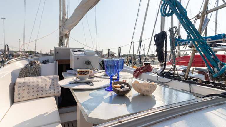 Die Küche an Bord ist mit einem Kühlschrank, einer Herdplatte, einer Kaffeemaschine und einem Wasserkocher ausgestattet, was die Selbstverpflegung für die Gäste ermöglicht. Es sind jedoch keine spezifischen Verpflegungsmöglichkeiten wie Restaurant oder Frühstücksservice erwähnt.