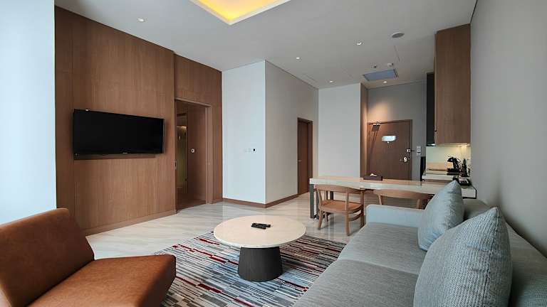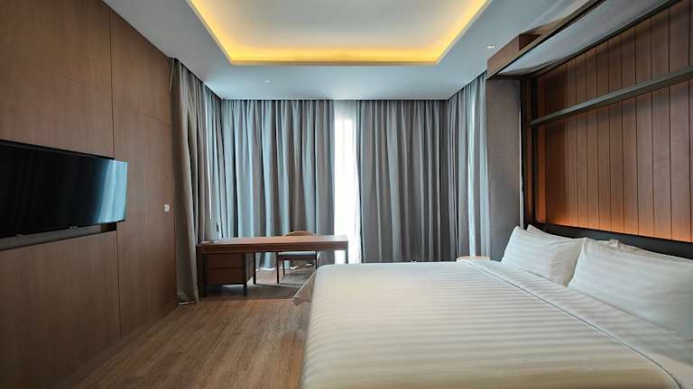 Die Zimmer sind klimatisiert und ausgestattet mit einem Queensizebett und einem Sofabett. Es stehen ein Safe, eine Minibar, ein Kühlschrank und eine Tee-/Kaffeemaschine zur Verfügung. Zudem gibt es einen Flachbild-TV sowie ein eigenes Badezimmer mit kostenlosen Pflegeprodukten und Hausschuhen. Familien- und Nichtraucherzimmer sind ebenfalls verfügbar.