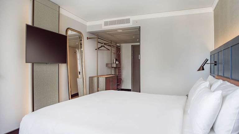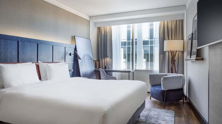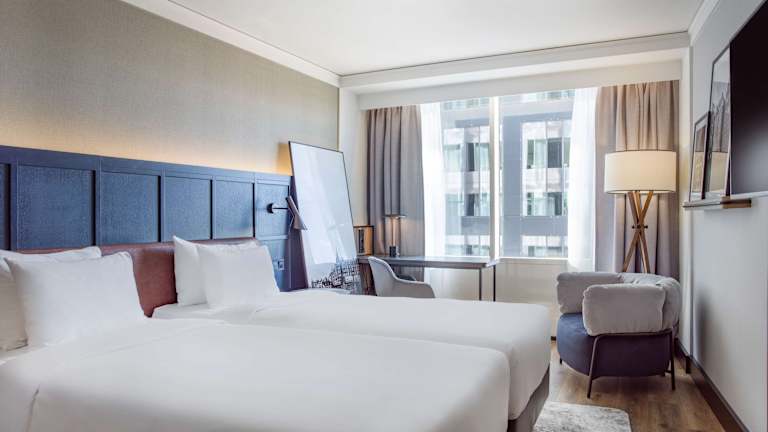 Die modernen Zimmer sind mit einer Klimaanlage, Heizung und einem Doppelbett ausgestattet. Zustellbetten sind auf Anfrage verfügbar. Zur Ausstattung gehören ein Safe, eine Minibar, ein Schreibtisch, ein Minikühlschrank sowie eine Tee-/Kaffeemaschine. Auch ein Bügelset, Telefon und Fernseher sind vorhanden. Die Badezimmer verfügen über eine Dusche sowie eine Badewanne und bieten Kosmetikartikel, einen Haartrockner und einen Kosmetikspiegel. Es stehen Familien-, Nichtraucher- und Raucherzimmer zur Verfügung.
