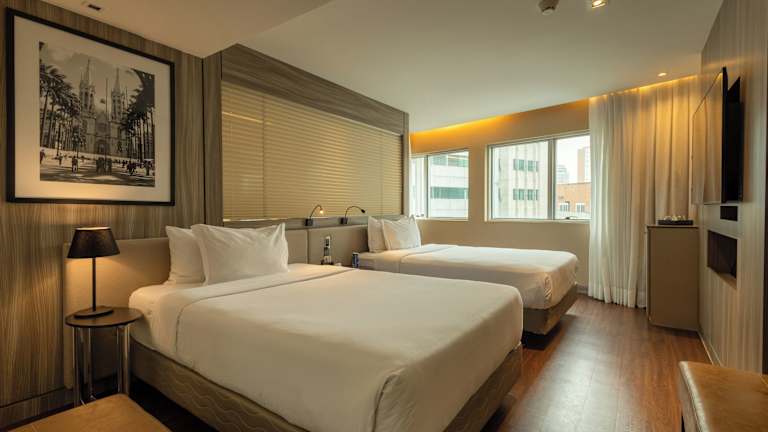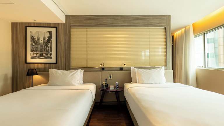 Die Zimmer sind modern und geräumig eingerichtet und bieten Annehmlichkeiten wie Klimaanlage, Safe, Schreibtisch, Flachbild-Kabel-TV, Minibar und Telefon. Die Badezimmer sind mit einer Dusche, Haartrockner und kostenfreien Pflegeprodukten ausgestattet. Einige Zimmer bieten einen Panoramablick auf die Stadt. Das Hotel bietet Familien- und Nichtraucherzimmer sowie rollstuhlgerechte Zimmer mit barrierefreiem Badezimmer.