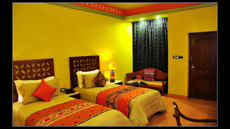 Die klimatisierten Zimmer sind im rajasthanischen Stil eingerichtet und verfügen über ein Doppelbett oder Kingsize-Bett, eine Minibar, einen Safe und einen Schreibtisch. Zur Ausstattung gehören ein Kühlschrank, eine Tee-/Kaffeemaschine sowie ein TV-Gerät mit Satelliten-/Kabelempfang. Im Badezimmer stehen kostenfreie Pflegeprodukte, ein Haartrockner und Bademäntel zur Verfügung. Es sind auch rollstuhlgerechte Zimmer buchbar.