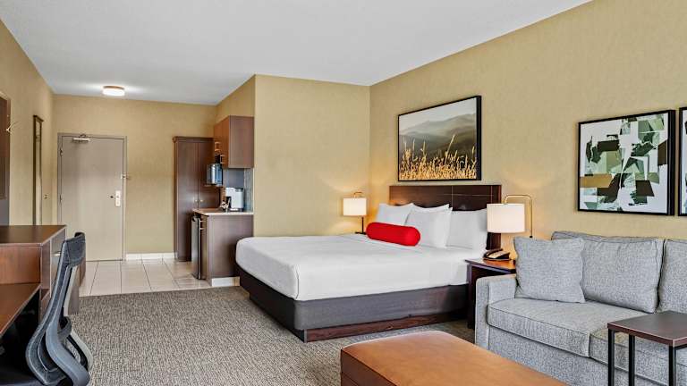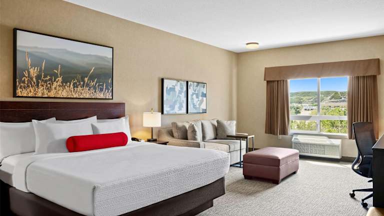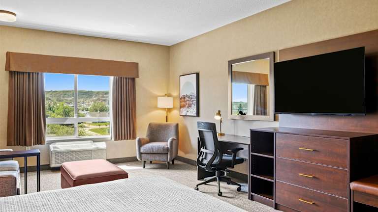 Die Zimmer im Ramada by Wyndham Drumheller Hotel & Suites sind geräumig und bieten eine moderne Ausstattung. Jedes Zimmer verfügt über eine Klimaanlage, ein bequemes Doppelbett, einen Schreibtisch, Kabel-TV und kostenfreies WLAN. Zusätzlich sind eine Mikrowelle, ein Mini-Kühlschrank sowie Tee- und Kaffeezubehör vorhanden.
