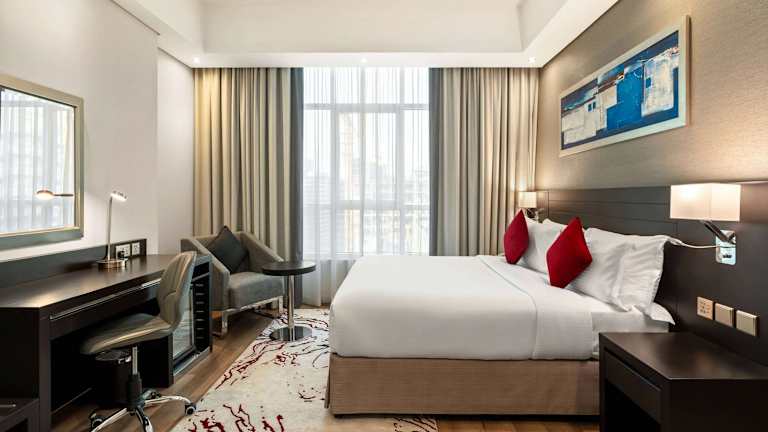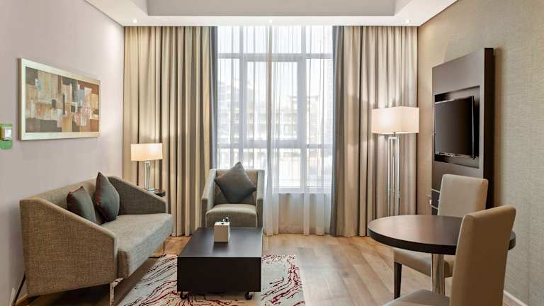 Die Zimmer sind klimatisiert und verfügen über Balkon oder Terrasse, Teppichboden, Doppelbett, Sofa und separates Schlafzimmer. Ausstattungsmerkmale sind ein Safe, eine Minibar, ein Kühlschrank, eine Tee-/Kaffeemaschine sowie ein Schreibtisch. Für zusätzlichen Komfort sorgen ein Flachbildschirmfernseher, Wifi ohne Gebühr, Hausschuhe und diverse Kosmetikartikel im Badezimmer. Das Hotel hat Familien-, Nichtraucher- und Raucherzimmer sowie rollstuhlgerechte Zimmer mit barrierefreiem Badezimmer.