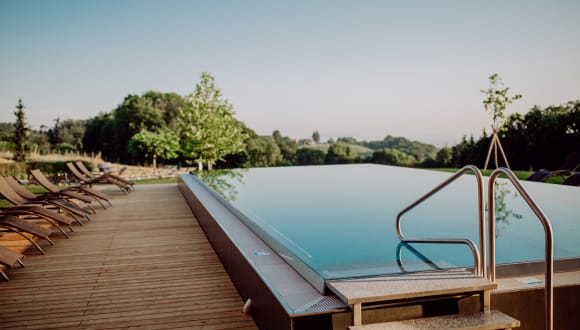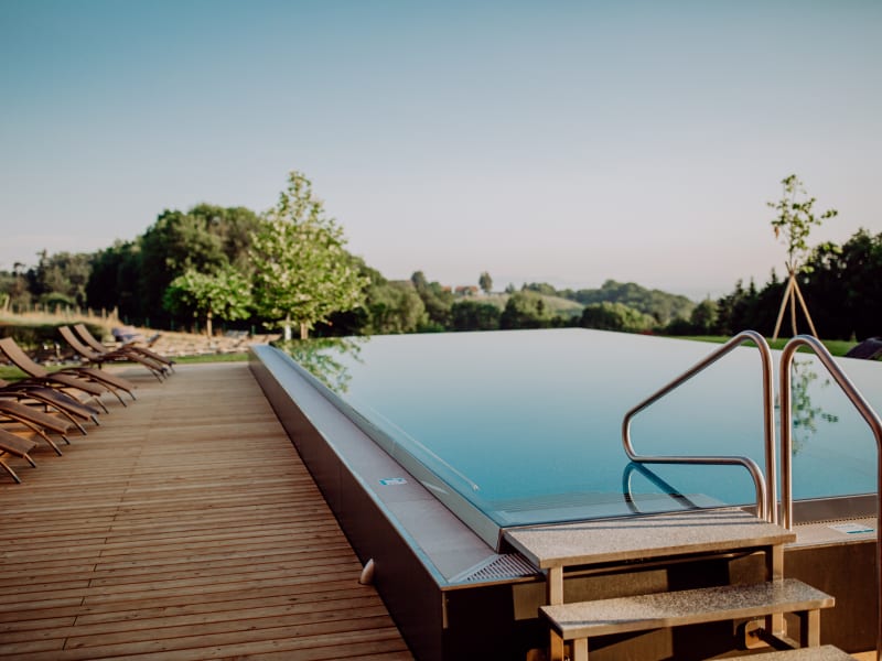 WANDERN | WELLNESSEN Der Wellnessbereich mit 2 Pools (Naturpool und beheizter Outdoor - Infinitypool), Saunen und großzügigen Ruheräumen sorgt für Erholung für Körper, Geist und Seele! Zahlreiche Weingüter und Buschenschänken säumen den Weg. Romantische Hügel, verschlungene Straßen und der ausgezeichnete Wein, das ist die Südsteirische Weinstraße! Bei uns brauchen Sie keine Wegzehrung mitnehmen. Sie können ganz entspannt von einer Buschenschank zur nächsten spazieren.