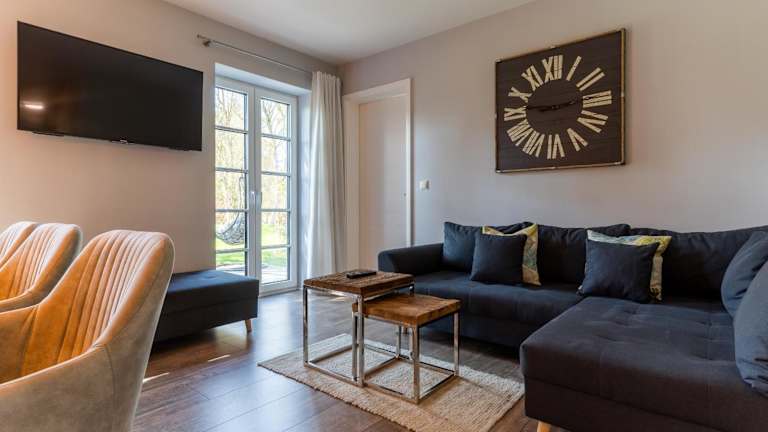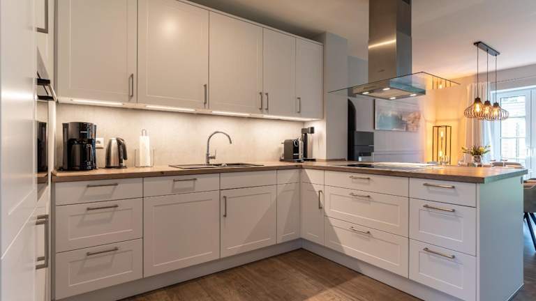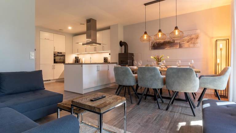 Die Unterkunft ist ausgestattet mit drei Schlafzimmern und bietet einen Fernseher sowie eine voll ausgestattete Küche. Diese beinhaltet einen Kühlschrank, einen Geschirrspüler, eine Waschmaschine, einen Ofen und eine Herdplatte, was eine eigenständige Verpflegung ermöglicht.