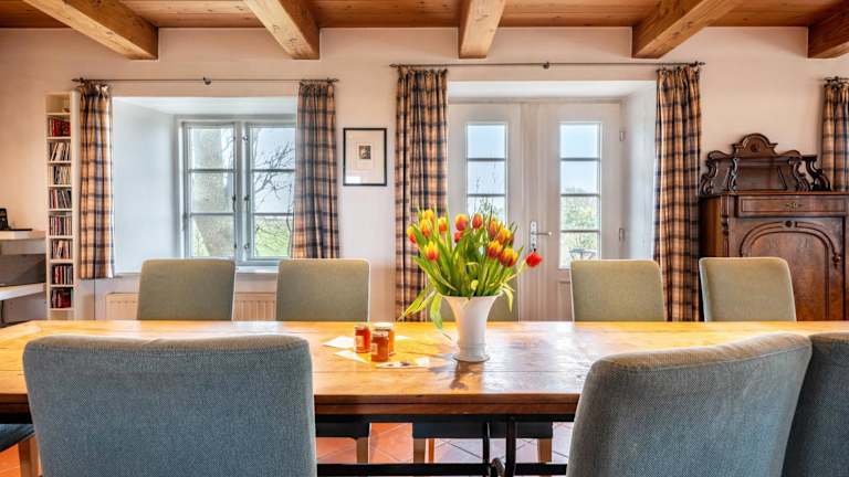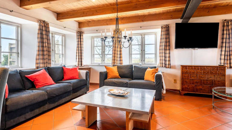 Das Ferienhaus verfügt über 6 Schlafzimmer und eine gut ausgestattete Küche mit Kühlschrank und Geschirrspüler. Die 3 Badezimmer sind mit Dusche, Haartrockner und Waschmaschine ausgestattet. Handtücher und Bettwäsche werden bereitgestellt.
