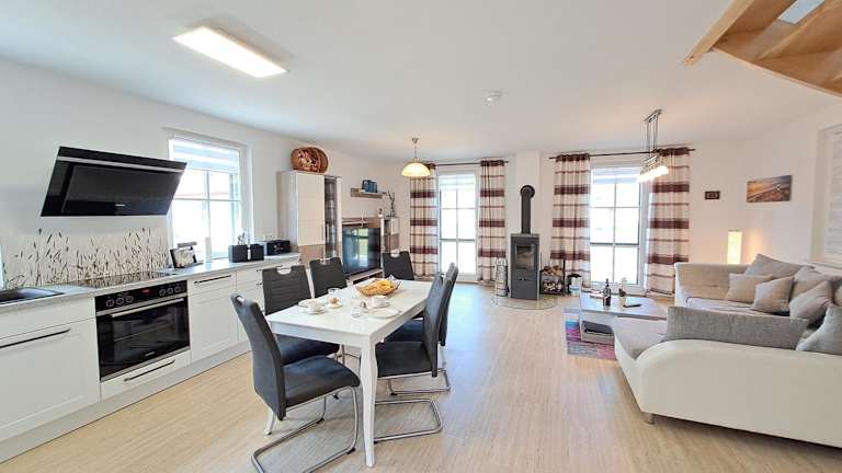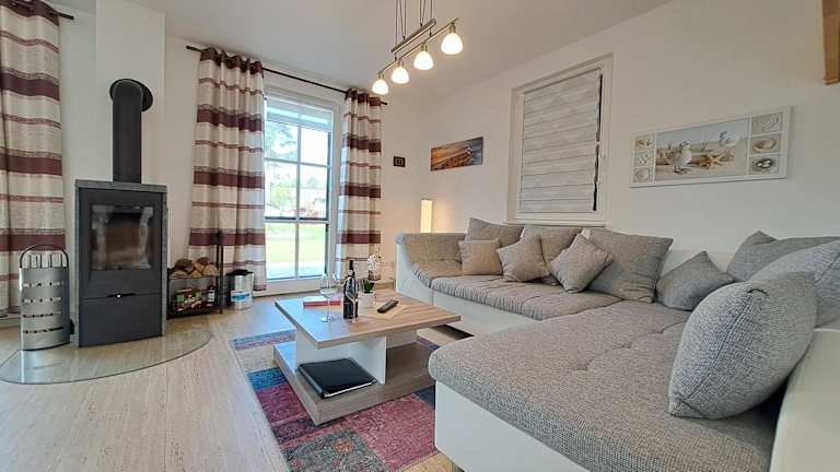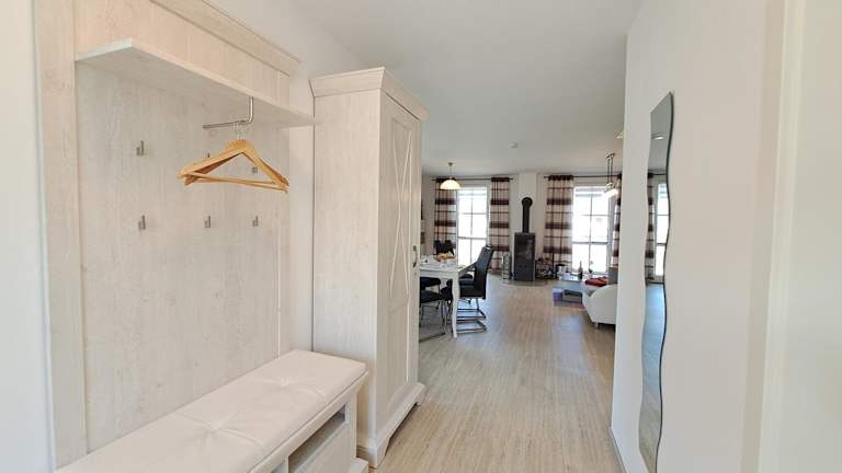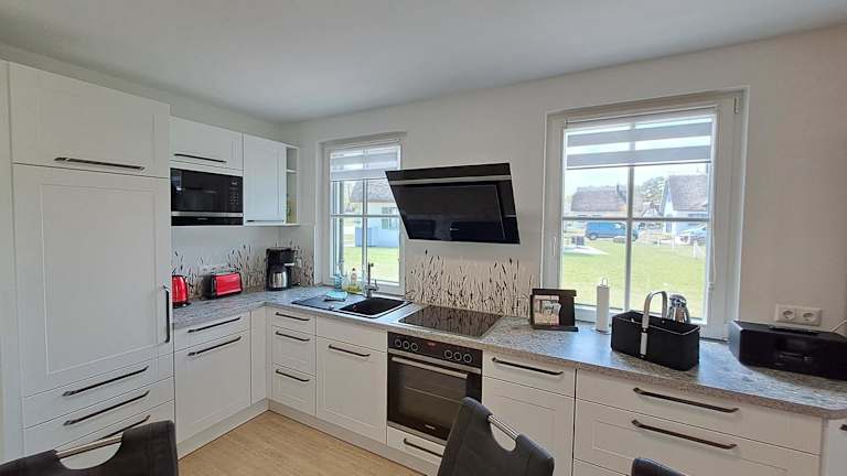 Das Ferienhaus verfügt über zwei Schlafzimmer sowie eine Küchenzeile, die mit einem Kühlschrank und einem Geschirrspüler ausgestattet ist. Des Weiteren sind zwei Badezimmer mit einer Dusche, einem Haartrockner und einer Waschmaschine vorhanden. Handtücher und Bettwäsche werden bereitgestellt, was für zusätzlichen Komfort sorgt.