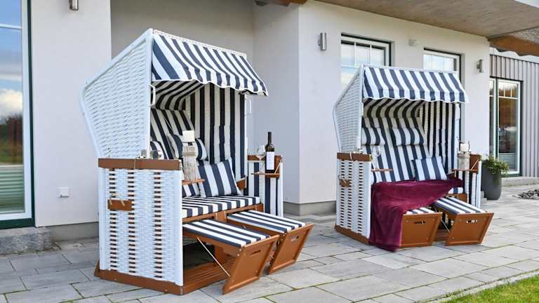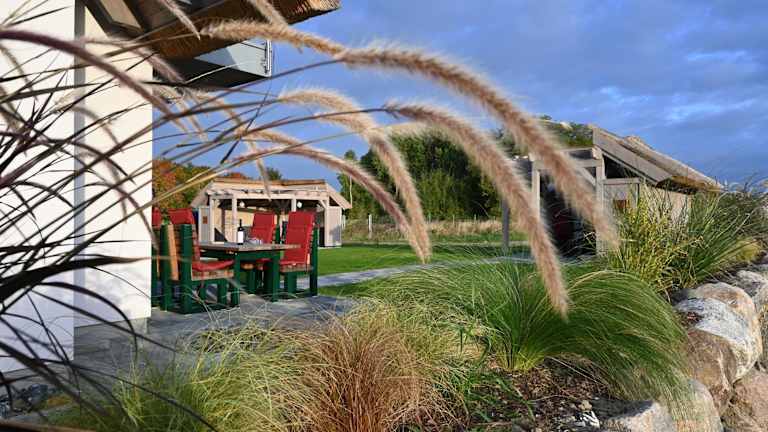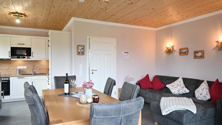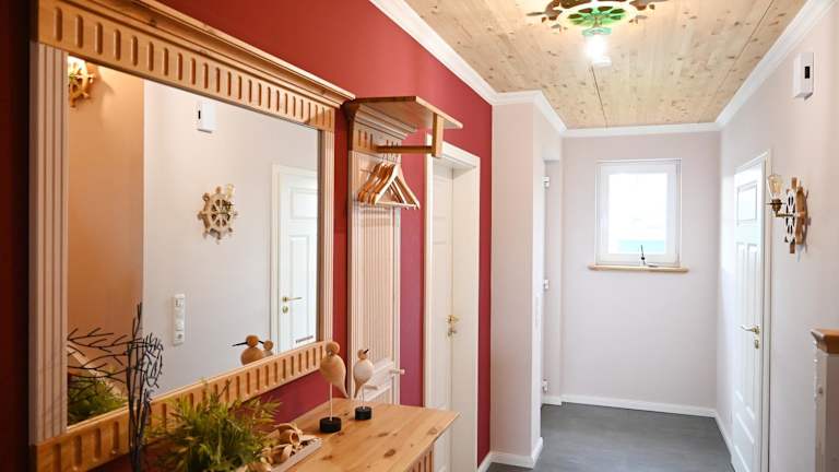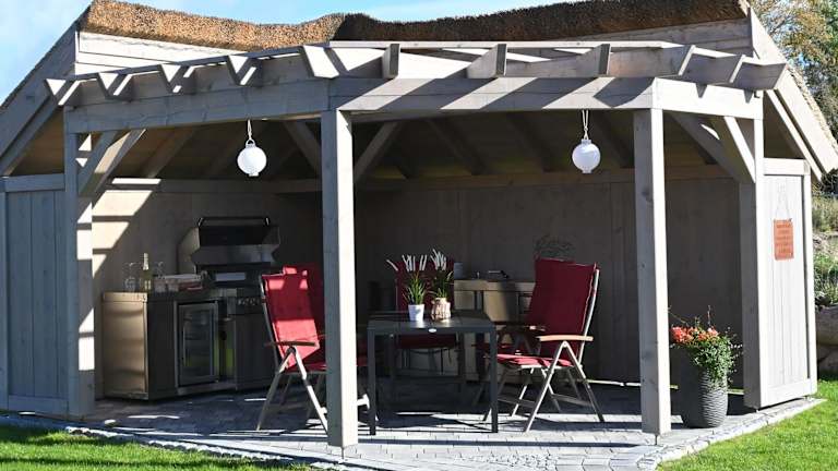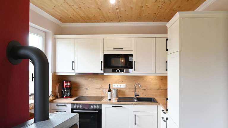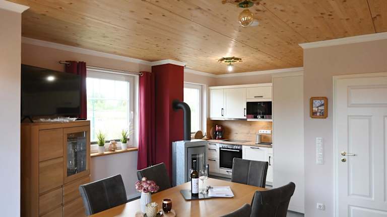 Die Ferienwohnung bietet eine gut ausgestattete Küche mit Kühlschrank und Geschirrspüler, um eigene Mahlzeiten zuzubereiten. Für eine gemütliche Atmosphäre sorgt der Grill im Garten.