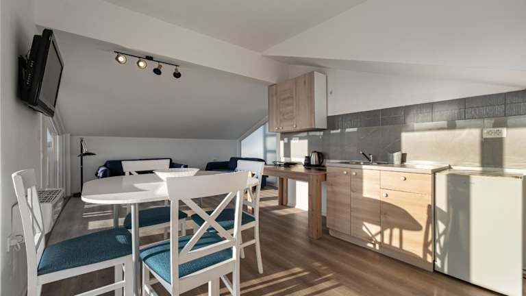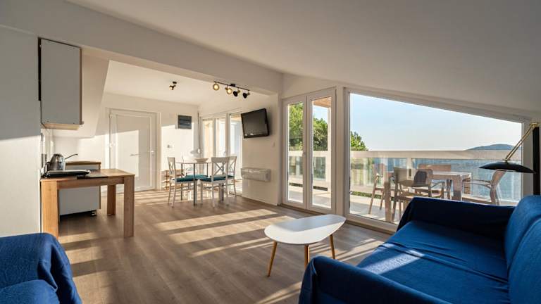 Die Wohneinheiten in der Regina Residence verfügen über einen Sitzbereich, einen Flachbild-TV, eine voll ausgestattete Küche mit Kühlschrank und Herdplatte sowie ein eigenes Badezimmer mit Dusche und kostenlosen Pflegeprodukten. Alle Zimmer bieten einen Balkon mit Blick auf den Pool.