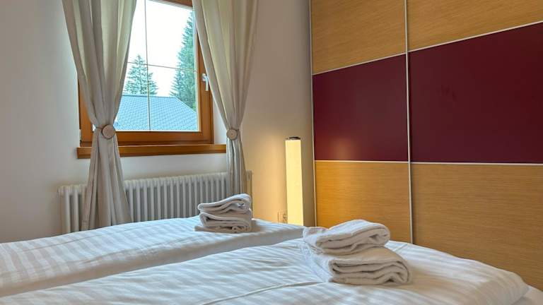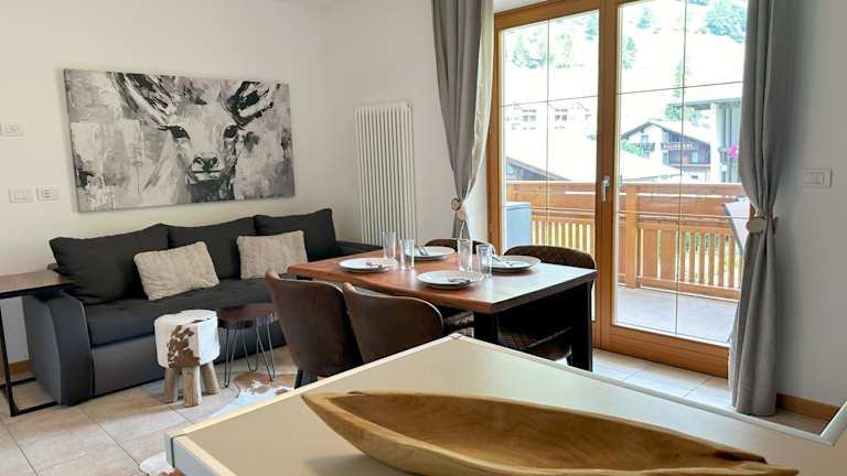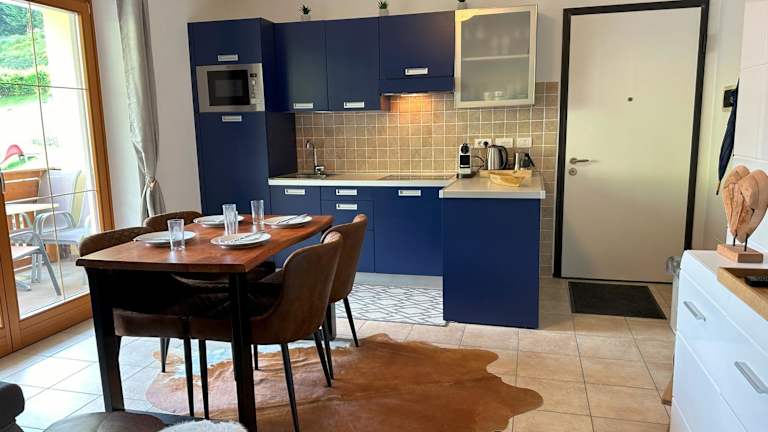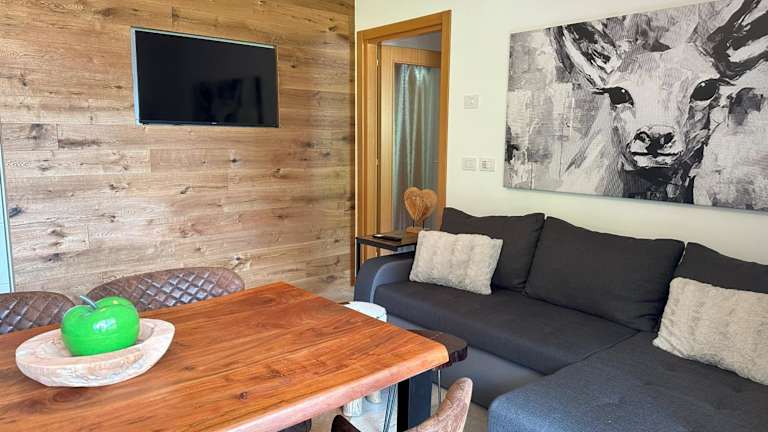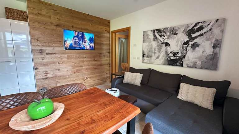 Die Ferienwohnung verfügt über ein Schlafzimmer, ein Wohnzimmer, einen Flachbild-TV und eine gut ausgestattete Küchenzeile mit Kühlschrank und Geschirrspüler. Des Weiteren bietet sie ein Badezimmer mit Bidet sowie einen Balkon mit Bergblick. Handtücher und Bettwäsche werden ebenfalls zur Verfügung gestellt.