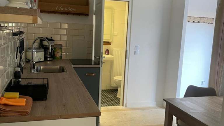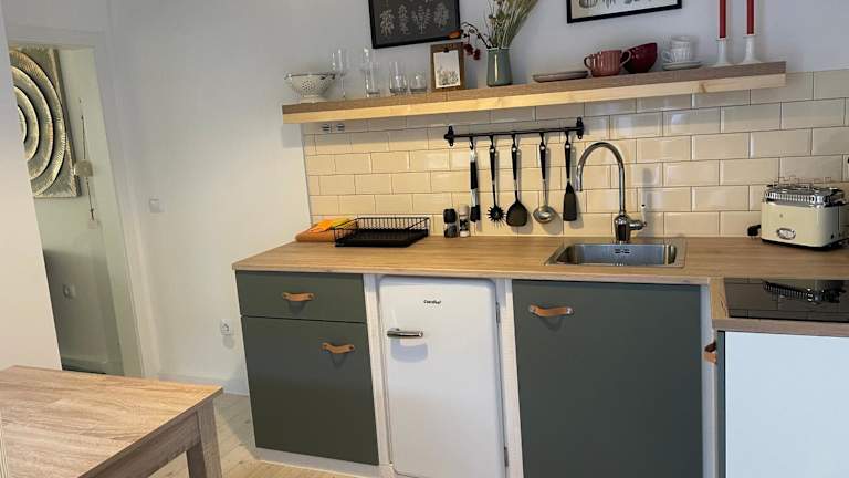 Die Unterkunft verfügt über eine voll ausgestattete Küche mit einem Kühlschrank und einer Kaffeemaschine, sodass sich Gäste eigenständig verpflegen können.