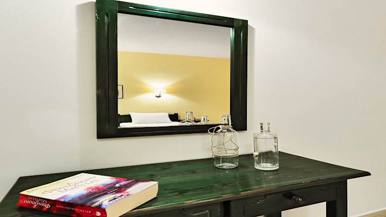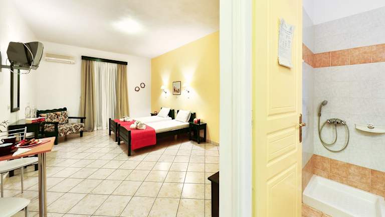 Die Zimmer sind klimatisiert und bieten einen Balkon oder eine Terrasse mit Bergblick. Die Ausstattung umfasst ein Doppelbett, einen Safe sowie ein Bad mit Dusche und Badewanne. Zudem sind ein Telefon, ein TV-Gerät und kostenloses Wifi vorhanden. In der Kochnische können Zimmergäste selbst kleine Mahlzeiten zubereiten.