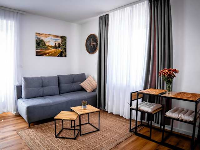 Die Wohneinheiten umfassen einen Sitzbereich, einen Flachbild-TV, eine ausgestattete Küche mit Kühlschrank, Geschirrspüler, Ofen, Kaffeemaschine und Wasserkocher. Ein Essbereich sowie ein eigenes Badezimmer sind ebenfalls vorhanden. Einige Zimmer haben zusätzlich eine Terrasse oder einen Balkon.