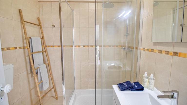 Die Ferienwohnung verfügt über ein Schlafzimmer, ein Wohnzimmer mit Flachbild-TV, eine gut ausgestattete Küche mit Kühlschrank und Geschirrspüler sowie ein Badezimmer mit Badewanne oder Dusche. Handtücher und Bettwäsche werden bereitgestellt. Eine Terrasse mit Meerblick ergänzt die komfortable Ausstattung.