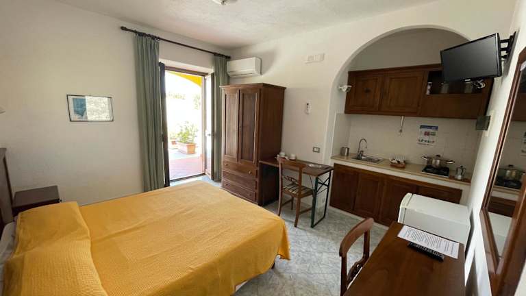 Die Unterkünfte zur Selbstversorgung sind mit Fliesenböden, Kabel Flachbild-TV, Kühlschrank und eigenem Badezimmer mit Bidet ausgestattet. Jedes Zimmer hat einen Zugang zur Terrasse und ist heimelig eingerichtet.