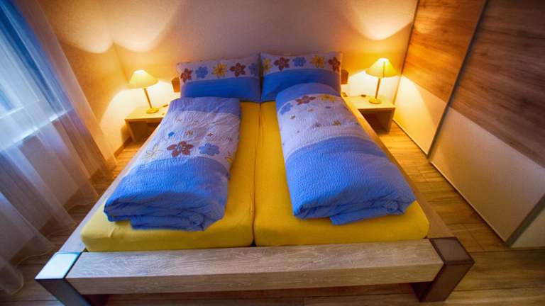Die Ferienwohnung besteht aus 2 Schlafzimmern, einem Wohnzimmer und einem Badezimmer mit Dusche. Sie bietet zudem einen Flachbild-TV, einen Kühlschrank, einen Geschirrspüler sowie Handtücher und Bettwäsche.