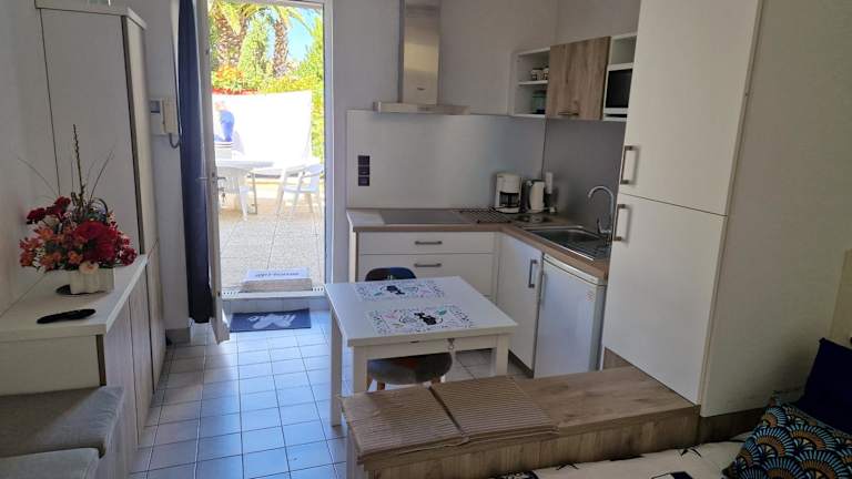 Alle Wohneinheiten verfügen über eine eigene Terrasse sowie eine Küche mit Kühlschrank und Mikrowelle. Die Zimmer beinhalten ein eigenes Badezimmer, Herdplatte, Kaffeemaschine und Wasserkocher. Bettwäsche, Handtücher und Wäsche werden nach den Richtlinien der örtlichen Behörden gewaschen.