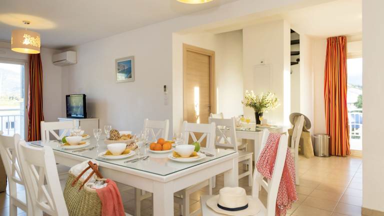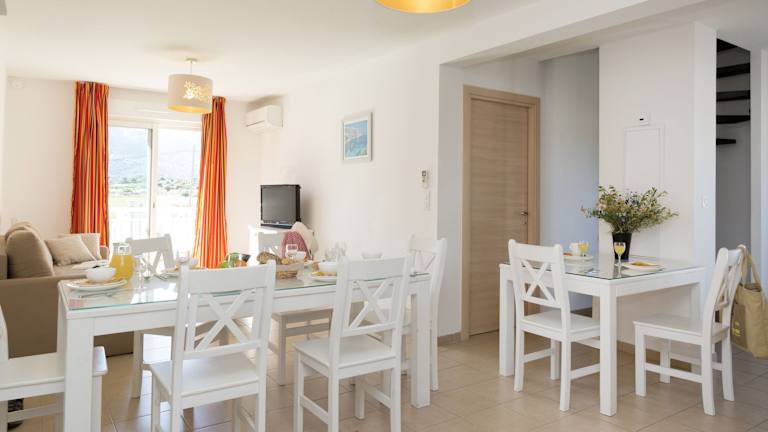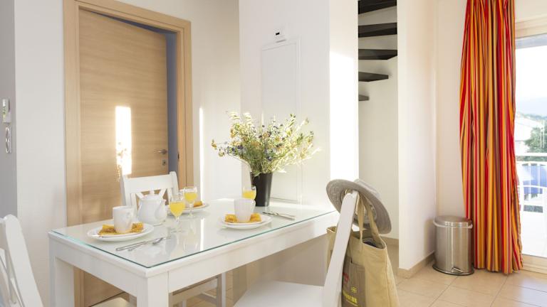 Die Zimmer sind mit Klimaanlage, Heizung und einem Balkon ausgestattet. Jedes Zimmer verfügt über ein Doppelbett, ein Sofabett und separate Schlafzimmer. Für die Familien stehen Kinderbetten zur Verfügung. Die Kochnische bietet einen Kühlschrank, eine Mikrowelle und eine Tee-/Kaffeemaschine. Zudem sind die Badezimmer mit einer Dusche und Badewanne ausgestattet. WLAN ist kostenlos verfügbar.