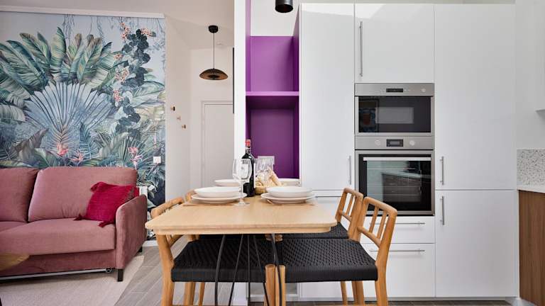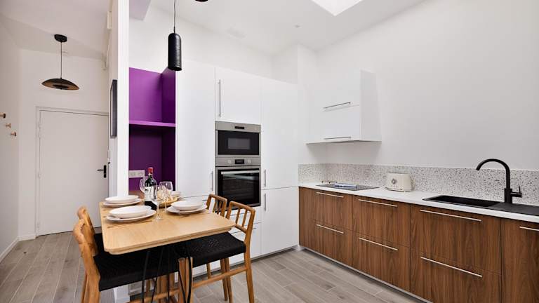 Die Ferienunterkunft ist mit einer voll ausgestatteten Küche ausgestattet, die Kühlschrank, Geschirrspüler, Ofen, Mikrowelle und Kaffeemaschine beinhaltet. Es sind keine Informationen zu Verpflegungsmöglichkeiten vorhanden.