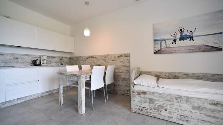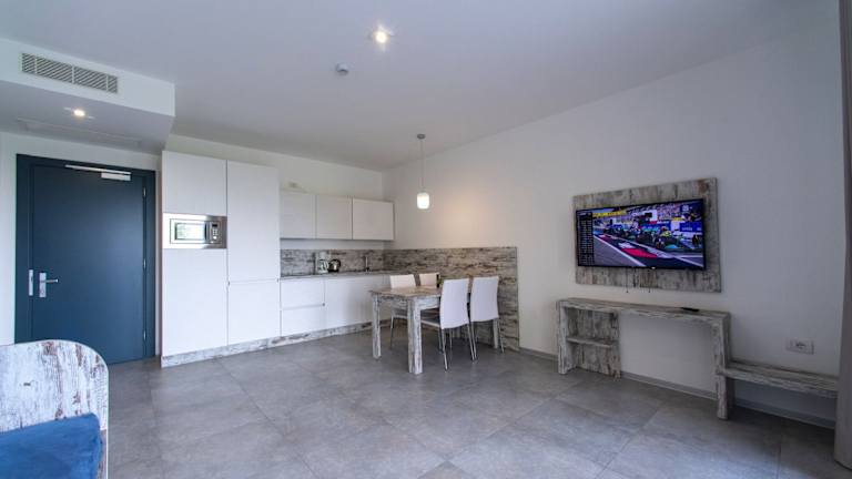Die Wohneinheiten sind mit einem Schlafsofa, einem Sitzbereich und einem Flachbild-TV mit Satellitenkanälen ausgestattet. Eine gut ausgestattete Küchenzeile mit Kühlschrank, Geschirrspüler, Mikrowelle und Wasserkocher ist ebenfalls vorhanden. Das eigene Badezimmer verfügt über ein Bidet und eine Dusche.