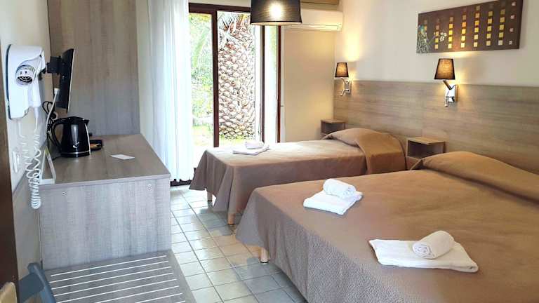 Die Zimmer sind mit Klimaanlage und Heizung ausgestattet. Sie verfügen über ein Doppelbett, ein Queensize-Bett oder ein Sofabett. Eine Kochnische, ein TV-Gerät und Wifi sind ebenfalls vorhanden. Im Badezimmer befindet sich eine Dusche sowie ein Haartrockner. Das Hotel bietet Familien- und Nichtraucherzimmer.