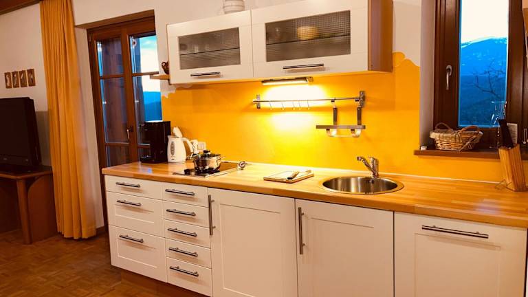 Die Ferienwohnung verfügt über ein Schlafzimmer, ein Wohnzimmer mit TV, eine gut ausgestattete Küche mit Kühlschrank und Geschirrspüler sowie ein Badezimmer mit Dusche. Zudem bietet die Wohnung einen Balkon mit Blick auf die Berge. Handtücher und Bettwäsche werden bereitgestellt.
