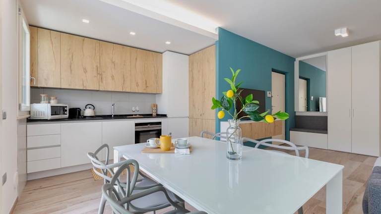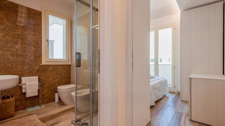Die Ferienwohnung umfasst zwei Badezimmer mit Bidet und Dusche. Handtücher und Bettwäsche sind in der Unterkunft erhältlich, jedoch sind diese nicht standardmässig vorhanden und müssen bei Bedarf entweder mitgebracht oder gegen eine Gebühr gemietet werden. Die Küche ist mit einem Kühlschrank und einer Kaffeemaschine ausgestattet.