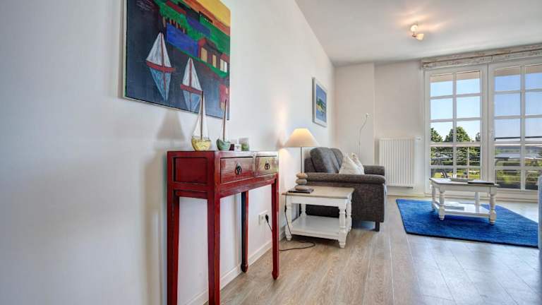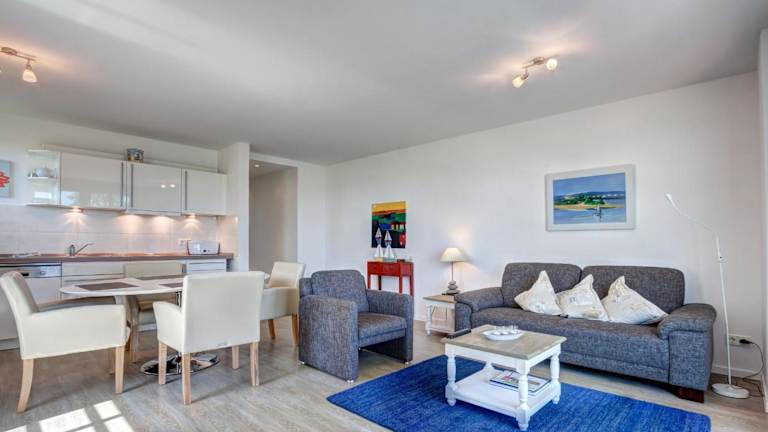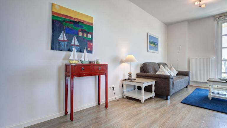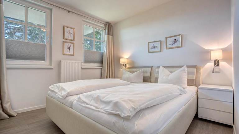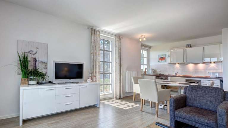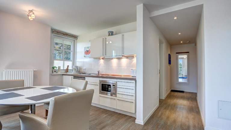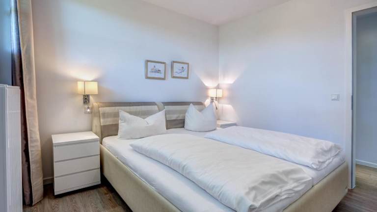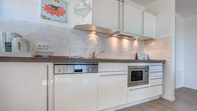 Die Ferienwohnung ist ausgestattet mit einem Schlafzimmer, einem TV und einer voll ausgestatteten Küche. Die Küche beinhaltet einen Kühlschrank, Geschirrspüler, Waschmaschine, Mikrowelle sowie eine Herdplatte. Handtücher und Bettwäsche werden bereitgestellt.