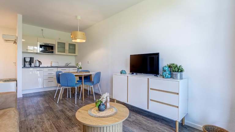 Die Ferienwohnung besteht aus 1 Schlafzimmer, einem Wohnzimmer, einer voll ausgestatteten Küche mit einem Kühlschrank und einer Kaffeemaschine sowie 1 Badezimmer mit Dusche und Haartrockner. Handtücher und Bettwäsche werden zur Verfügung gestellt.
