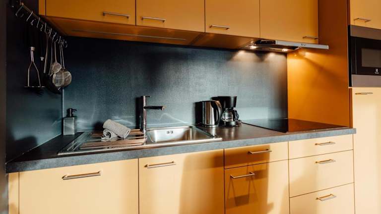 Die Ferienwohnung bietet eine Küchenzeile, ausgestattet mit einem Kühlschrank und Geschirrspüler. Weitere Verpflegungsmöglichkeiten sind nicht angegeben.