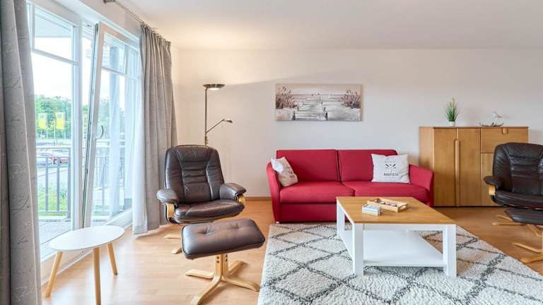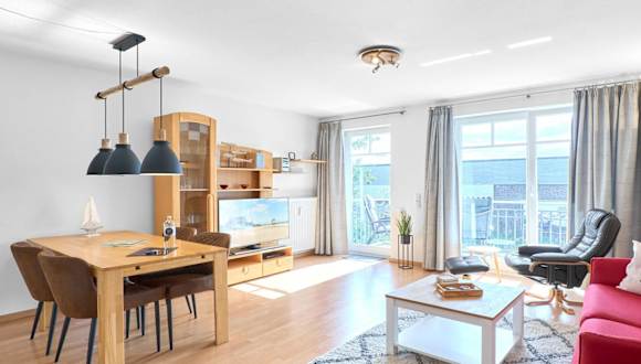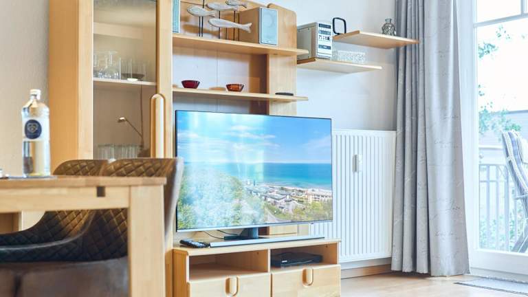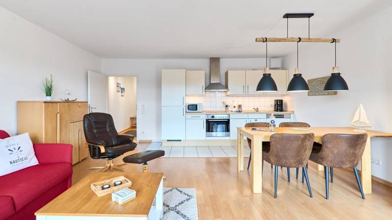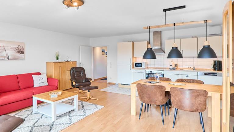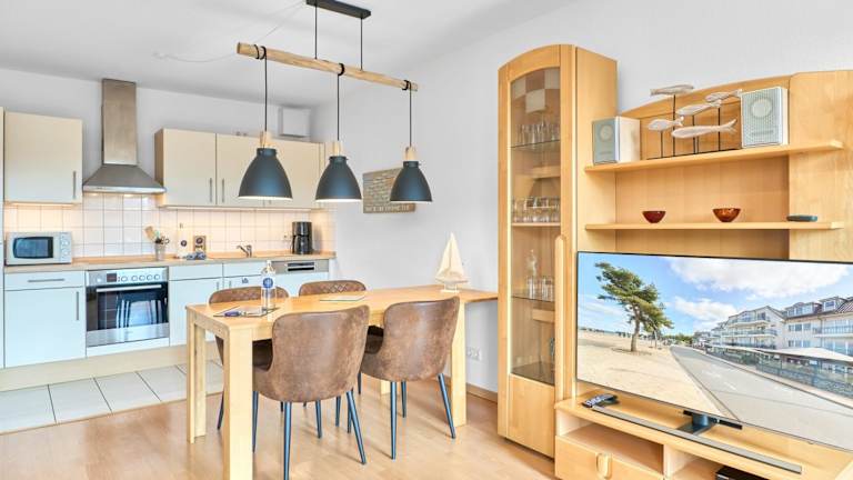 Die Ferienwohnung beinhaltet ein Schlafzimmer und ist mit einem TV sowie einer voll ausgestatteten Küche ausgestattet. In der Küche befinden sich ein Kühlschrank, Geschirrspüler, Waschmaschine, Ofen und eine Herdplatte. Zur weiteren Ausstattung gehören Handtücher und Bettwäsche.