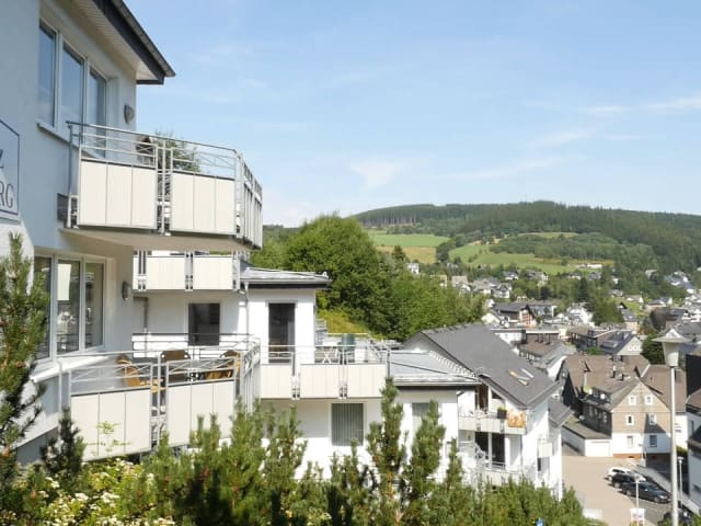 Anlagenbeschreibung: Unsere Residenz Mühlenberg liegt unmittelbar im Zentrum von Willingen. Die 5 freistehenden, in Südhanglage errichteten Gebäude fügen sich harmonisch in das Willinger Ortsbild ein. In der Anlage finden Sie 28 modern und komplett eingerichtete Ferienwohnungen für 1-6 Personen. Anlagenausstattung: Die Wohnungen, bis ins Detail praktisch durchdacht und funktionell gestaltet, bieten Platz für bis zu 6 Personen. Großzügige Raumaufteilung auf bis zu 70 m² Wohnfläche (Wohnraum, voll ausgestatteter Küchenbereich, 1 bzw. 2 Schlafräume, Dusche/WC, SAT-TV mit Empfang sky Cinema, sky Sport 1, sky Fußball Bundesliga, separater Abstellraum, z.T. mit Telefon). Fast alle Wohnungen verfügen über großzügige Balkone oder Terrassen mit traumhafter Fernsicht über Willingen und das Ittertal. Zu jeder Wohnung gehört ein Tiefgaragen- oder Autostellplatz. Im mittleren Residenzbereich befindet sich das Vermietungsbüro. Abstellraum für Fahrräder, Skier und Rodel in der Tiefgarage. Münzwaschmaschine/-trockner. Die Umgebung Im Herzen des Hochsauerlandes liegt Willingen, umgeben von endlos scheinenden Wäldern, den höchsten Bergen des Sauerlandes, Tälern, Wiesen, sowie Europas einziger Hochheide auf dem Ettelsberg. Willingen ist heute die Adresse für einen attraktiven Urlaub im Mittelgebirge: Ob Sie nun aktiven Urlaub suchen oder ob Sie einfach Stress und den Alltag hinter sich lassen möchten. Willingen im Sauerland, wilde Schönheit, herrlicher Landstrich, Land der tausend Berge, Natur pur, deftig und gemütlich, Schneeparadies, Kurort für Jung und Alt. All dies sind nur einige Beispiele für die Meinungen derjenigen, die Willingen besucht haben. Gute Unterhaltung Willingen bietet ein breites Veranstaltungsprogramm: geführte Picknick- oder Fackelwanderungen, Konzerte, z. B. von den Willinger Alphorn bläsern, Ohnsorg-Theater, Eislauf-Gala, Kneipp- & Kräuter markt, Tanzabende, Upland-Erlebnis- Rundfahrten, Planwagen- und Pferdeschlittenfahrten, Mattenski springen, World- und Continental-Cup-Skispringen, Nordische Meisterschaften, Internationale Rollerskirennen, Kinderfeste, Einkehr in Siggis Hütte,... Sport & Fun – Wellness: Zwei Tennis- und eine Badmintonschule, zahlreiche Hallen- und Freiplätze. Radverleih und organisierte Mountainbike-Touren im Sommer und Winter. Reitmöglichkeiten und drei Flugschulen für das Drachen- und Gleitschirmflugerlebnis. Ganzjähriges kostenloses Freizeit- und Sportprogramm für ein gezieltes Fitnesstraining: Aquatraining, Jogging, Body-Shaping, Stretching und Aerobic. Viel Spaß auch beim Rollerski, Free climbing, Kletterhalle, Hochseilgarten, Beach-Volleyball, Street-Ball oder im Fitnesstudio. Indoor-Kart- und Bowlingcenter. Der nahgelegene Diemelsee ermöglicht Bade-, Surf- und Segelspaß. Schneezirkus – volle Kanone: Schnee satt Über Nacht legt sich eine weiche Schneedecke über Wald, Wiesen, Häuser und Wege. Jetzt blüht der berühmte Weltcup-Skiort auf: Auf den Ettelsberg mit der neuen 8-Personen-Kabinenbahn, den Schleppliften, den Rodelhängen, den Langlauf-Loipen und den Abfahrtspisten. Skifahrer wedeln den steilen Sonnenhang hinunter oder üben Snow-Boarding in der Skischule. Andere genießen die kristallklare Winterluft beim Wandern auf den geräumten Wegen, andere tummeln sich im Eisstadion. Durchweg beste Pisten garantiert die neue 7 km lange Willinger Beschneiungsanlage den ganzen Winter über, sogar abends unter Flutlicht.