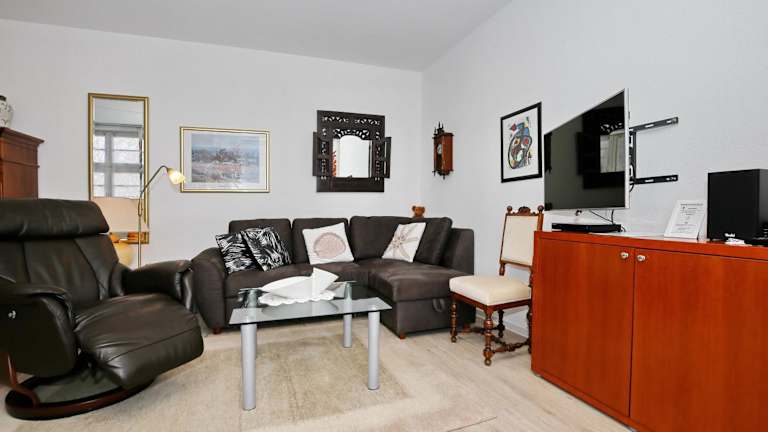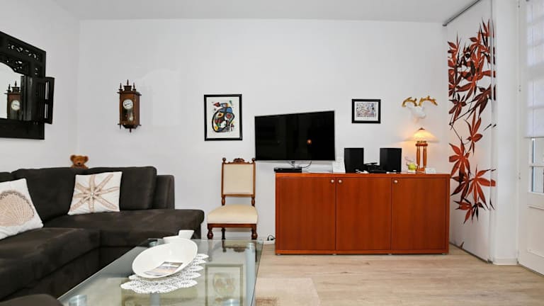 Die Ferienwohnung ist mit einem Balkon ausgestattet und bietet ein Schlafzimmer sowie ein Wohnzimmer. Die Küche verfügt über moderne Geräte wie Kühlschrank und Geschirrspüler. Zusätzlich stehen ein TV und ein DVD-Player zur Verfügung, um entspannte Abende zu gestalten.