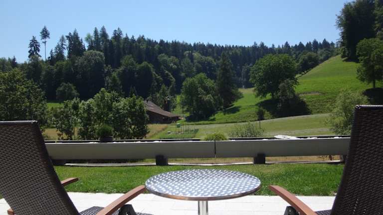 Die Ferienwohnung bietet ein Schlafzimmer, ein Wohnzimmer, ein gut ausgestattetes Badezimmer mit Dusche, sowie eine Küche mit Kühlschrank und Ofen. Zu den weiteren Annehmlichkeiten gehören ein Flachbild-TV und eine Terrasse mit Blick auf die Berge.