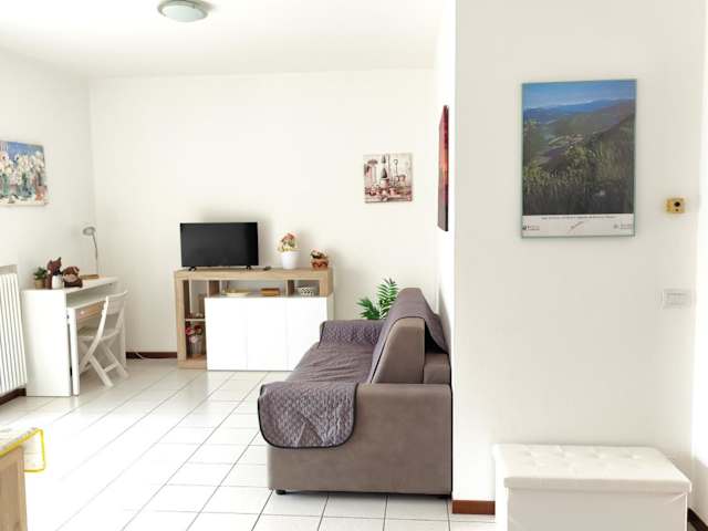 Die Ferienwohnung verfügt über ein Schlafzimmer, ein Wohnzimmer mit einem Flachbild-TV sowie eine voll ausgestattete Küche mit Kühlschrank und Ofen. Ein Badezimmer mit Bidet ist ebenfalls vorhanden. Handtücher und Bettwäsche werden bereitgestellt.