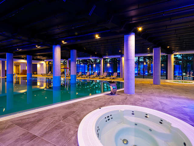 Im Gebäude erwartet die Gäste ein großzügiger Innenpool mit spannenden Attraktionen für Kinder, entspannende Saunen, eine wohltuende Salzgrotte und ein erholsames Dampfbad. Das Spa bietet eine vielfältige Auswahl an hochwertigen Behandlungen und wohltuenden Massagen. Für die jüngsten Gäste gibt es liebevoll gestaltete Animationsprogramme, während die Erwachsenen am Abend stimmungsvolle Live-Musik genießen können.