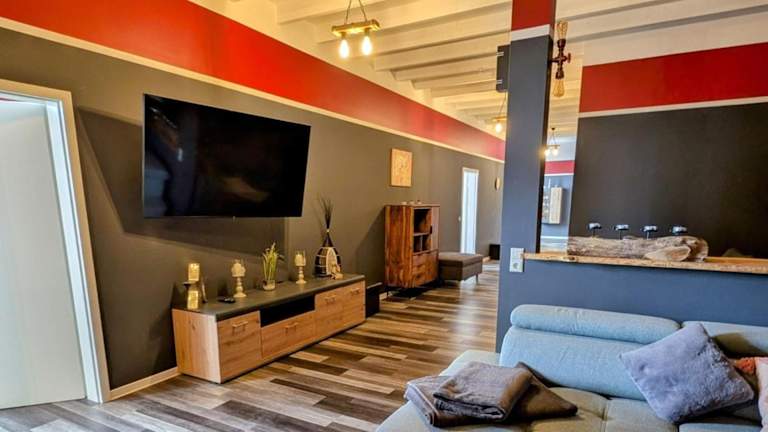 Rhin Quartier Ferienwohnung Loft-Style ist eine geräumige Ferienwohnung im Loft-Style und umfasst 4 Schlafzimmer, ein Wohnzimmer, eine voll ausgestattete Küche sowie 4 Badezimmer. Ein Flachbild-TV ist ebenfalls vorhanden.
