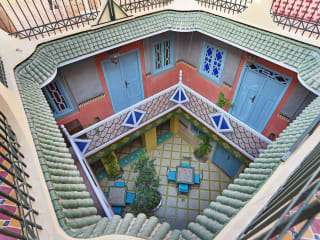 Zimmer: Alle Zimmer verfügen über Klimaanlage und Extraktion über die Toilette. Die Badezimmer sind komplett und die Zimmer sind geräumig für marokkanische Konzepte. Aber das Leben in einem Riad ist meistens im Patio und in der Lounge. Zimmer 1. "Bab Aïlen" Dies ist das erste Zimmer (hauptfarbe rot) im Erdgeschoss. Die Größe dieses Zimmers ist durchschnittlich und der Preis ist das auch. Die weichen roten Farben erinnern an die rote Stadt, wie Marrakesch genannt wird. Darüber hinaus machen Grautöne in verschiedenen marokkanischen Stuck den Raum zu einer intimen Atmosphäre. Der Boden ist auch wirklich marokkanisch. Es gibt ein Festbett für zwei Personen. Ein Einzelbett kann hinzugefügt werden. Zimmer 2. "Mellah" Dieser Raum (hauptfarbe Oker) befindet sich auch im Erdgeschoss zwischen der Lounge und der Küche. Es ist kein großes Zimmer, aber der Preis ist von Vorteil. Es gibt ein Doppelbett, das abgebaut werden kann. Wieder finden sich wunderschöne Naturfarben außerhalb von Marrakesch: von braun, gelb bis zum rot! Es sind schöne natürliche Farben. Tadelakt, Stuck oder einfach gefärbt: wir kommen darüber hinaus. Die Dusche ist von einer Dusche von Berber inspiriert und verwendet. Zimmer 3. "Bab Doukala" Dies ist das erste Zimmer im ersten Stock. Der Preis ist durchschnittlich. Dieser Raum, genannt Bab Doukala, hat zwei Fenster zur Terrasse, ein weiteres drittes Fenster nach außen. Das ist ganz anders, denn ein marokkanisches Haus (Riad) ist ein nach innen gerichtetes Man hat keine Fenster nach draußen. Es ist also ein blindes Fenster (Witz). Es gibt ein Festbett fur twei Personen, aber ein Einzelbett kann hinzugefügt werden. Das Badezimmer ist aus marokkanischem Marmor und der Boden des Raumes ist eine Kombination aus zementgebundenen Fliesen und glasierten Steinen. Ein doppelter Bogen über dem Bett mit viel indirekter Beleuchtung, machen dieses Zimmer zu einem romantischen Raum! Es sind noch 4 weitere Zimme!