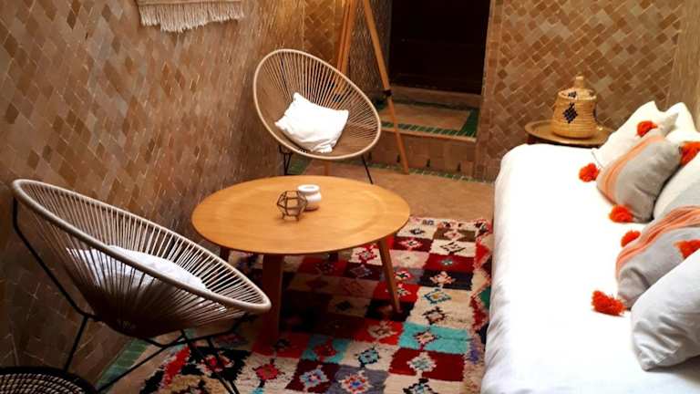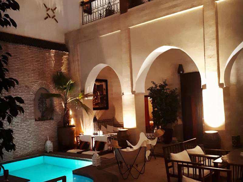 Das Riad Amira bietet eine einladende Atmosphäre mit modernen, marokkanisch inspirierten Zimmern. Das Hotel verfügt über eine Dachterrasse mit Blick auf Marrakesch und eine grosse Terrasse mit Pool. Es gibt ein stilvolles Wohnzimmer, in dem sich Gäste entspannen können.